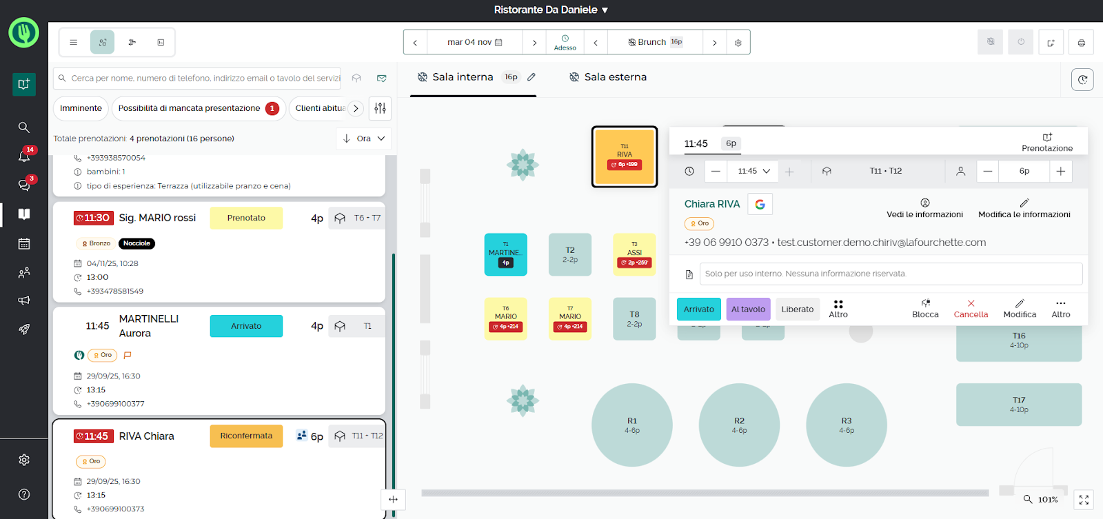 Permette di impostare turni e arrivi scaglionati per evitare sovraffollamento. La mappa digitale della sala ottimizza l'assegnazione dei tavoli in tempo reale e la gestione della lista d'attesa, fornendo stime più precise e riducendo l'incertezza per il cliente.